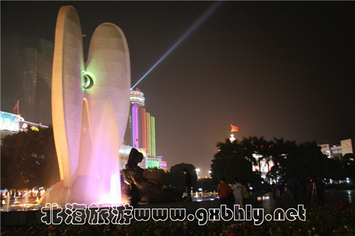 北部灣廣場(chǎng)川流不息的人群和車輛,那顆明珠和噴泉尤為出眾。