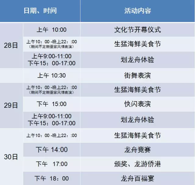生猛海鮮節(jié)除了可以品嘗海產(chǎn)品等特色美食外,還有疍家特色飾品店、服裝、時尚飲品、北海特產(chǎn)等等。賽龍舟是僑港鎮(zhèn)慶賀端午節(jié)的傳統(tǒng)活動之一,活動當(dāng)天船員首先用肥豬肉在船底抹油、協(xié)力安裝龍頭,龍舟200米直道往返競賽,還有祭港儀式等,場面熱鬧非凡。龍舟的龍頭在疍家人的心里地位非常重要,寓意平安、吉祥等好意頭。本次活動推出龍舟龍頭展覽,供旅客拍照,同時也舉行龍頭游街祈;顒樱慰褪忻窨筛惺軣狒[的節(jié)日氛圍。這一具有濃郁民俗色彩的群眾性文化活動,每年都吸引不少市民和中外游客前來觀看,今年新增了體驗(yàn)項(xiàng)目,參加活動的市民游客還可參與體驗(yàn)賽龍舟等。