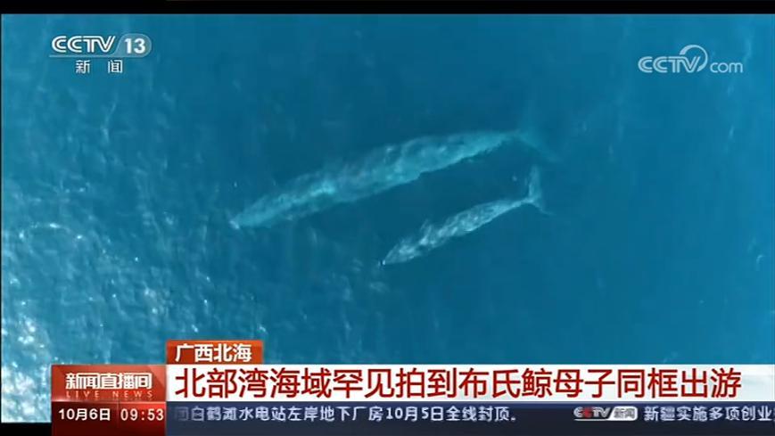 央視今早播出,潿洲島外海航拍發(fā)現(xiàn)一對母子布氏鯨