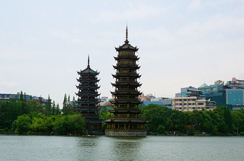 日月雙塔:坐落在杉湖中,日塔為銅塔,位于湖中心,高41米,共9層,月塔為琉璃塔,高35米,共7層。兩塔之間以18米長的水下水族館相連。銅塔所有構件如塔什、瓦面、翹角、門拱、雀替、門窗、柱梁、天面、地面等均由鋼材鑄鍛而成,并以精美的銅壁畫裝飾,整座銅塔涵蓋了三項世界之最--世界上最高的銅塔,世界上最高的銅質建筑物,世界上最高的水中塔。日月雙塔是桂林兩江四湖夜景重要的景色之一 。