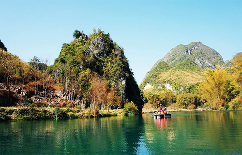 從洞中透過(guò)入口處,三角形的洞口如畫(huà)家定景框,把遠(yuǎn)處青山和近處翠巒、綠竹、田疇、水面和垂釣漁人組成絕妙的畫(huà)面,山如寶石,人若游仙,水光山色,交相襯托,令游客傾倒。盤(pán)陽(yáng)河自巴馬甲篆鄉(xiāng)吉屯白熊洞潛入山下,形成了1500多米的伏流暗河,然后從此洞流出,是盤(pán)陽(yáng)河注入紅水河前的最后一處伏流出水口。洞中鐘乳石千姿百態(tài),各肖物類(lèi),水碧石凈,光環(huán)影繞,特別是伴隨著游船的前行,在每隔兩三百米就有一個(gè)天窗而形成日光月色的光感效果及在光與影不斷變幻的時(shí)光隧道中,猶如經(jīng)歷了“三天三夜”的神奇感受而令人興奮不已。因進(jìn)出此洞有“三明三暗”處,仿若“三天三夜”,故英國(guó)洞穴探險(xiǎn)隊(duì)層由衷地感嘆在洞中探秘可體味在地球上消失三天三夜的感覺(jué)。洞的盡頭有一塊 巨大巖石,裂痕石縫形成:“人、人、壽”三個(gè)字。